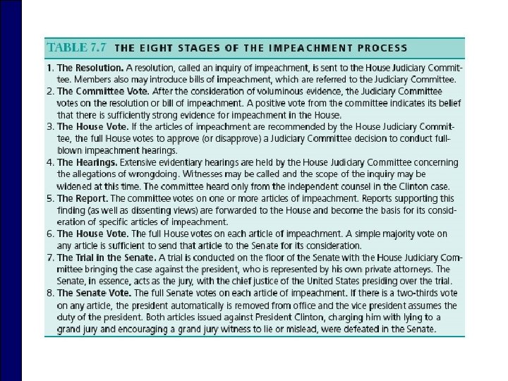Congress and the President o Constitution envisioned that Congress and the president would have: n Discrete powers n One branch would be able to hold the other in check n Since the 1930 s, the president has had the upper hand o But Congress still has ultimate legislative authority to question executive actions and o Congress can impeach and even remove him from office