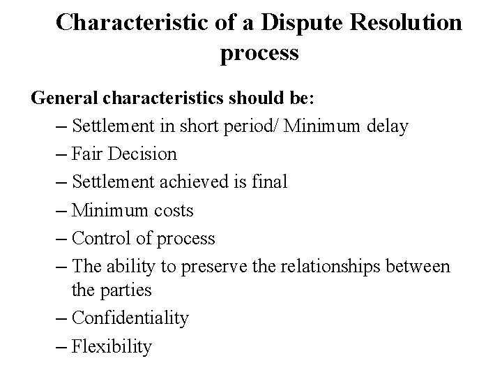 Characteristic of a Dispute Resolution process General characteristics should be: – Settlement in short period/ Minimum delay – Fair Decision – Settlement achieved is final – Minimum costs – Control of process – The ability to preserve the relationships between the parties – Confidentiality – Flexibility
