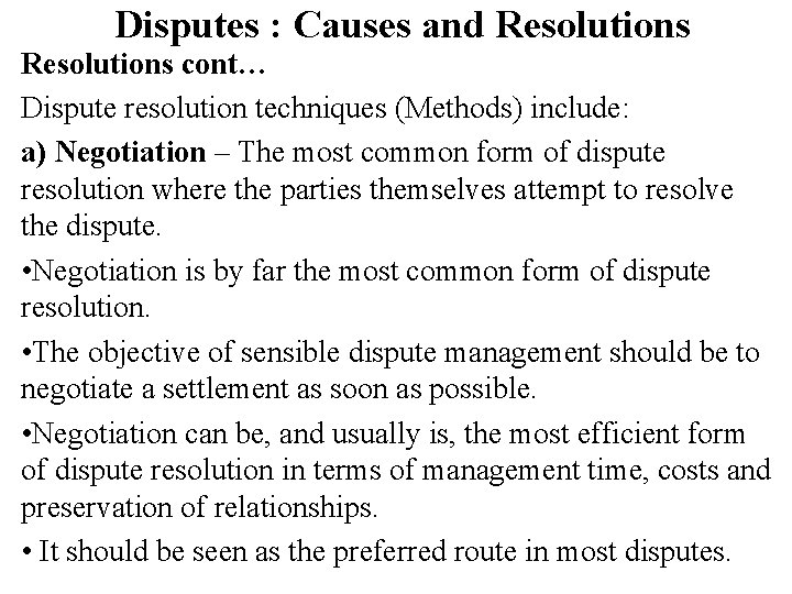 Disputes : Causes and Resolutions cont… Dispute resolution techniques (Methods) include: a) Negotiation – The most common form of dispute resolution where the parties themselves attempt to resolve the dispute. • Negotiation is by far the most common form of dispute resolution. • The objective of sensible dispute management should be to negotiate a settlement as soon as possible. • Negotiation can be, and usually is, the most efficient form of dispute resolution in terms of management time, costs and preservation of relationships. • It should be seen as the preferred route in most disputes.
