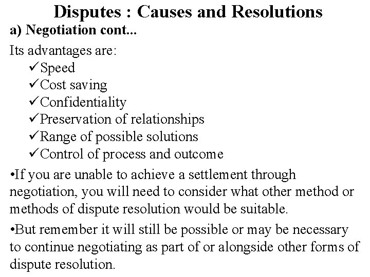 Disputes : Causes and Resolutions a) Negotiation cont. . . Its advantages are: üSpeed üCost saving üConfidentiality üPreservation of relationships üRange of possible solutions üControl of process and outcome • If you are unable to achieve a settlement through negotiation, you will need to consider what other method or methods of dispute resolution would be suitable. • But remember it will still be possible or may be necessary to continue negotiating as part of or alongside other forms of dispute resolution.