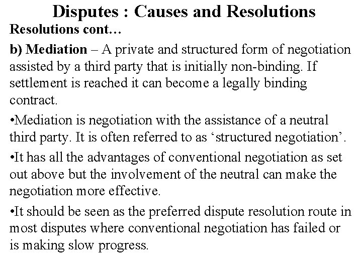Disputes : Causes and Resolutions cont… b) Mediation – A private and structured form of negotiation assisted by a third party that is initially non-binding. If settlement is reached it can become a legally binding contract. • Mediation is negotiation with the assistance of a neutral third party. It is often referred to as ‘structured negotiation’. • It has all the advantages of conventional negotiation as set out above but the involvement of the neutral can make the negotiation more effective. • It should be seen as the preferred dispute resolution route in most disputes where conventional negotiation has failed or is making slow progress.