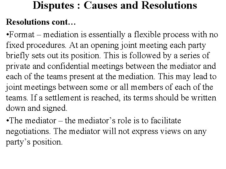 Disputes : Causes and Resolutions cont… • Format – mediation is essentially a flexible process with no fixed procedures. At an opening joint meeting each party briefly sets out its position. This is followed by a series of private and confidential meetings between the mediator and each of the teams present at the mediation. This may lead to joint meetings between some or all members of each of the teams. If a settlement is reached, its terms should be written down and signed. • The mediator – the mediator’s role is to facilitate negotiations. The mediator will not express views on any party’s position.
