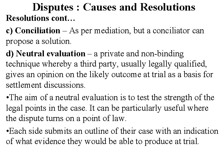 Disputes : Causes and Resolutions cont… c) Conciliation – As per mediation, but a conciliator can propose a solution. d) Neutral evaluation – a private and non-binding technique whereby a third party, usually legally qualified, gives an opinion on the likely outcome at trial as a basis for settlement discussions. • The aim of a neutral evaluation is to test the strength of the legal points in the case. It can be particularly useful where the dispute turns on a point of law. • Each side submits an outline of their case with an indication of what evidence they would be able to produce at trial.