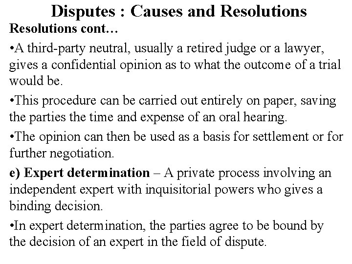 Disputes : Causes and Resolutions cont… • A third-party neutral, usually a retired judge or a lawyer, gives a confidential opinion as to what the outcome of a trial would be. • This procedure can be carried out entirely on paper, saving the parties the time and expense of an oral hearing. • The opinion can then be used as a basis for settlement or further negotiation. e) Expert determination – A private process involving an independent expert with inquisitorial powers who gives a binding decision. • In expert determination, the parties agree to be bound by the decision of an expert in the field of dispute.