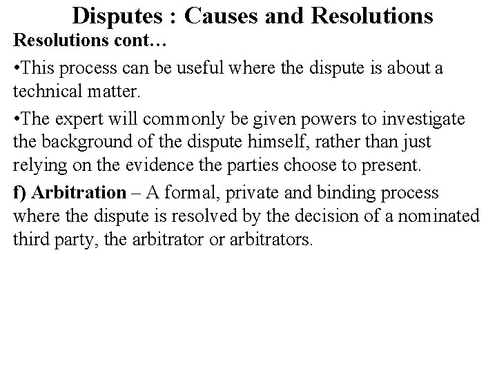 Disputes : Causes and Resolutions cont… • This process can be useful where the dispute is about a technical matter. • The expert will commonly be given powers to investigate the background of the dispute himself, rather than just relying on the evidence the parties choose to present. f) Arbitration – A formal, private and binding process where the dispute is resolved by the decision of a nominated third party, the arbitrator or arbitrators.