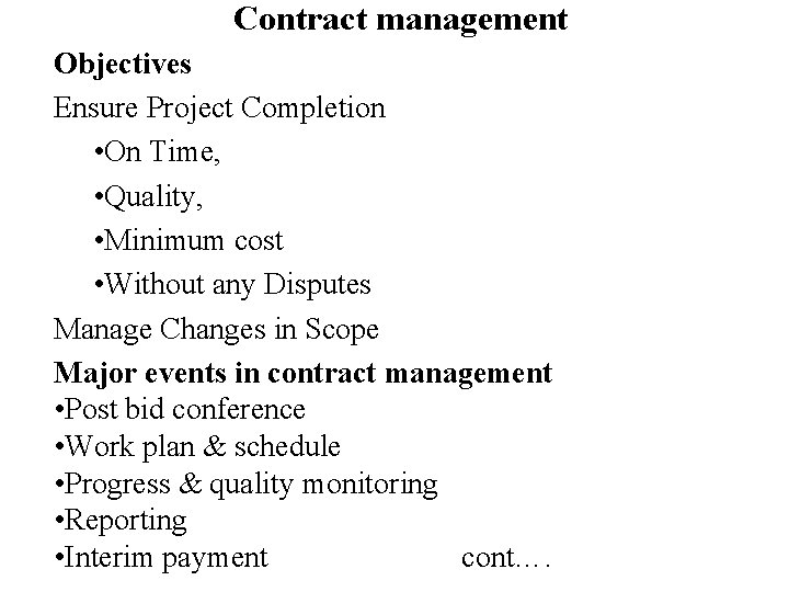 Contract management Objectives Ensure Project Completion • On Time, • Quality, • Minimum cost • Without any Disputes Manage Changes in Scope Major events in contract management • Post bid conference • Work plan & schedule • Progress & quality monitoring • Reporting • Interim payment cont….