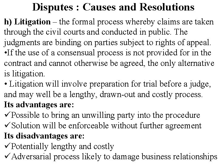 Disputes : Causes and Resolutions h) Litigation – the formal process whereby claims are taken through the civil courts and conducted in public. The judgments are binding on parties subject to rights of appeal. • If the use of a consensual process is not provided for in the contract and cannot otherwise be agreed, the only alternative is litigation. • Litigation will involve preparation for trial before a judge, and may well be a lengthy, drawn-out and costly process. Its advantages are: üPossible to bring an unwilling party into the procedure üSolution will be enforceable without further agreement Its disadvantages are: üPotentially lengthy and costly üAdversarial process likely to damage business relationships