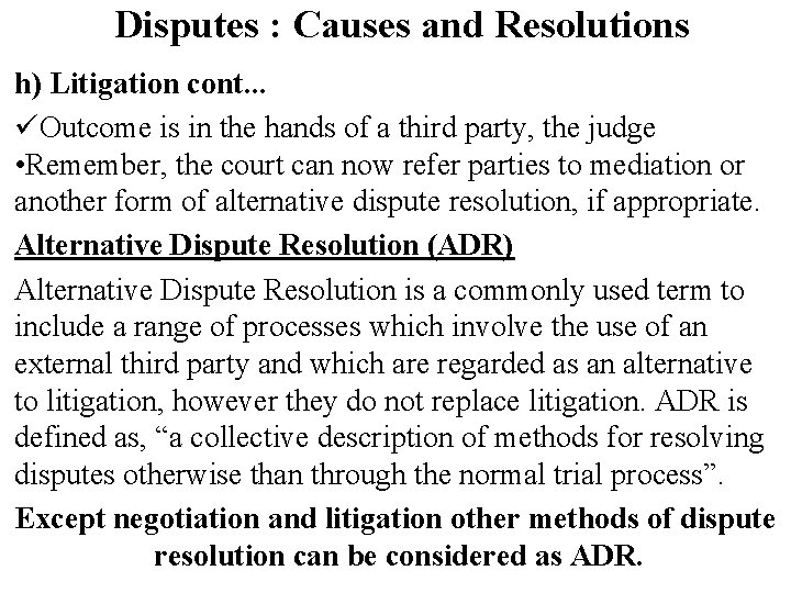 Disputes : Causes and Resolutions h) Litigation cont. . . üOutcome is in the hands of a third party, the judge • Remember, the court can now refer parties to mediation or another form of alternative dispute resolution, if appropriate. Alternative Dispute Resolution (ADR) Alternative Dispute Resolution is a commonly used term to include a range of processes which involve the use of an external third party and which are regarded as an alternative to litigation, however they do not replace litigation. ADR is defined as, “a collective description of methods for resolving disputes otherwise than through the normal trial process”. Except negotiation and litigation other methods of dispute resolution can be considered as ADR.