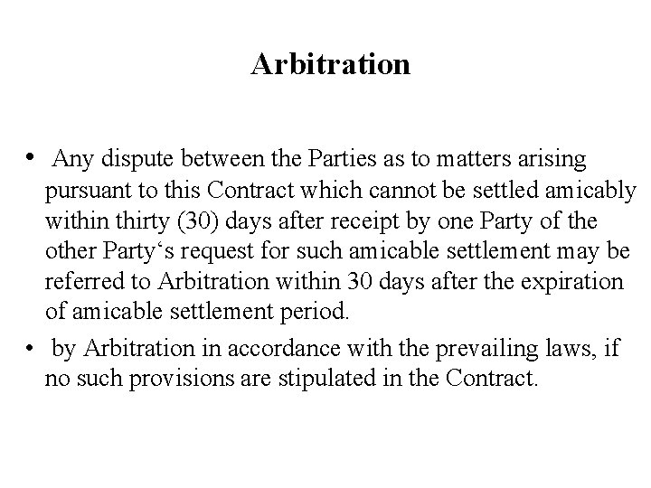 Arbitration • Any dispute between the Parties as to matters arising pursuant to this Contract which cannot be settled amicably within thirty (30) days after receipt by one Party of the other Party‘s request for such amicable settlement may be referred to Arbitration within 30 days after the expiration of amicable settlement period. • by Arbitration in accordance with the prevailing laws, if no such provisions are stipulated in the Contract.