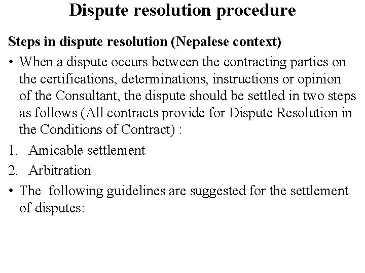 Dispute resolution procedure Steps in dispute resolution (Nepalese context) • When a dispute occurs between the contracting parties on the certifications, determinations, instructions or opinion of the Consultant, the dispute should be settled in two steps as follows (All contracts provide for Dispute Resolution in the Conditions of Contract) : 1. Amicable settlement 2. Arbitration • The following guidelines are suggested for the settlement of disputes: