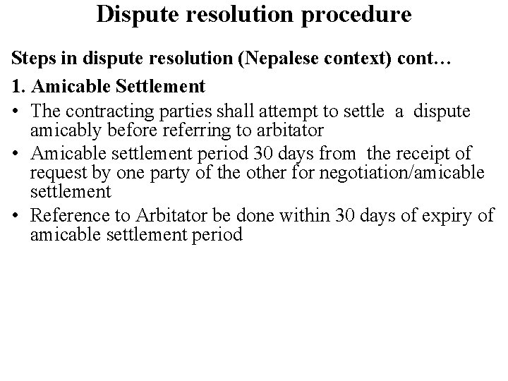 Dispute resolution procedure Steps in dispute resolution (Nepalese context) cont… 1. Amicable Settlement • The contracting parties shall attempt to settle a dispute amicably before referring to arbitator • Amicable settlement period 30 days from the receipt of request by one party of the other for negotiation/amicable settlement • Reference to Arbitator be done within 30 days of expiry of amicable settlement period