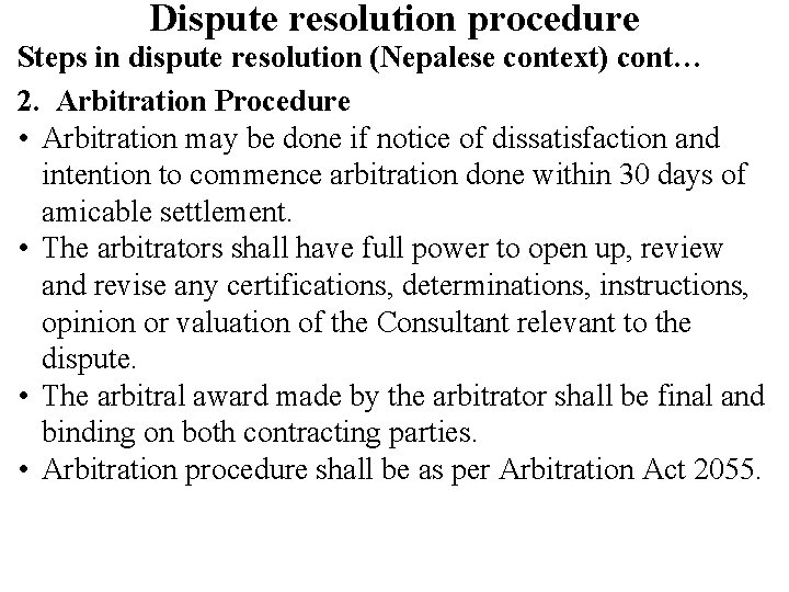 Dispute resolution procedure Steps in dispute resolution (Nepalese context) cont… 2. Arbitration Procedure • Arbitration may be done if notice of dissatisfaction and intention to commence arbitration done within 30 days of amicable settlement. • The arbitrators shall have full power to open up, review and revise any certifications, determinations, instructions, opinion or valuation of the Consultant relevant to the dispute. • The arbitral award made by the arbitrator shall be final and binding on both contracting parties. • Arbitration procedure shall be as per Arbitration Act 2055.