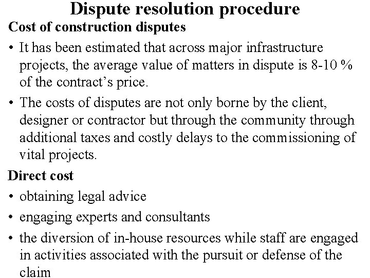 Dispute resolution procedure Cost of construction disputes • It has been estimated that across major infrastructure projects, the average value of matters in dispute is 8 -10 % of the contract’s price. • The costs of disputes are not only borne by the client, designer or contractor but through the community through additional taxes and costly delays to the commissioning of vital projects. Direct cost • obtaining legal advice • engaging experts and consultants • the diversion of in-house resources while staff are engaged in activities associated with the pursuit or defense of the claim