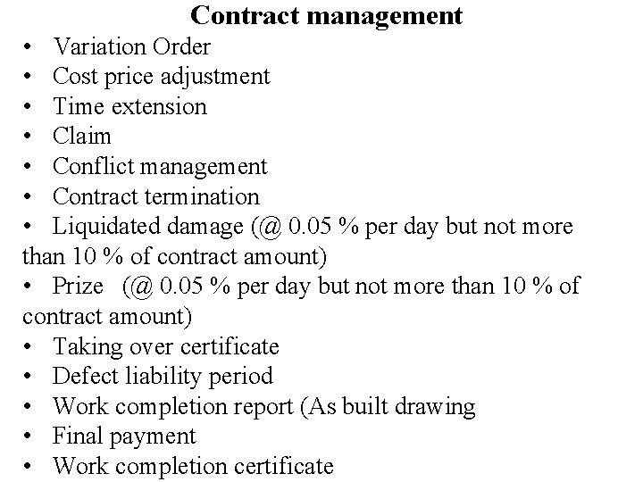 Contract management • Variation Order • Cost price adjustment • Time extension • Claim • Conflict management • Contract termination • Liquidated damage (@ 0. 05 % per day but not more than 10 % of contract amount) • Prize (@ 0. 05 % per day but not more than 10 % of contract amount) • Taking over certificate • Defect liability period • Work completion report (As built drawing • Final payment • Work completion certificate