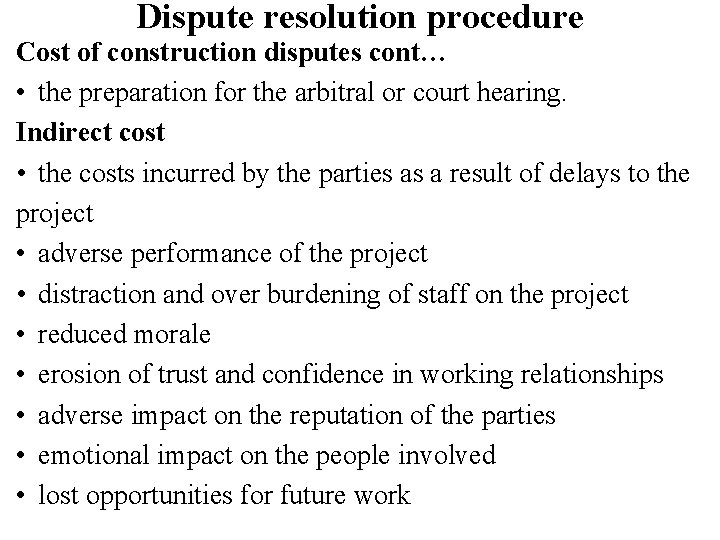Dispute resolution procedure Cost of construction disputes cont… • the preparation for the arbitral or court hearing. Indirect cost • the costs incurred by the parties as a result of delays to the project • adverse performance of the project • distraction and over burdening of staff on the project • reduced morale • erosion of trust and confidence in working relationships • adverse impact on the reputation of the parties • emotional impact on the people involved • lost opportunities for future work
