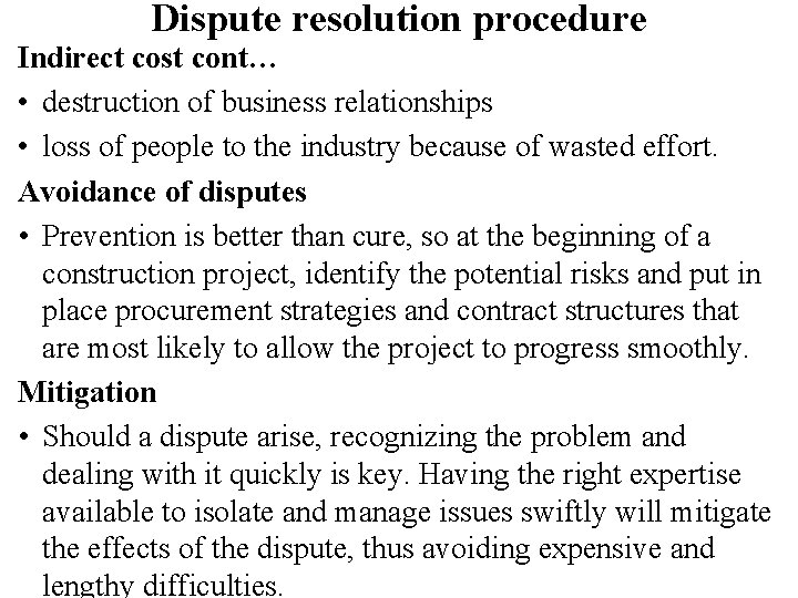 Dispute resolution procedure Indirect cost cont… • destruction of business relationships • loss of people to the industry because of wasted effort. Avoidance of disputes • Prevention is better than cure, so at the beginning of a construction project, identify the potential risks and put in place procurement strategies and contract structures that are most likely to allow the project to progress smoothly. Mitigation • Should a dispute arise, recognizing the problem and dealing with it quickly is key. Having the right expertise available to isolate and manage issues swiftly will mitigate the effects of the dispute, thus avoiding expensive and lengthy difficulties.