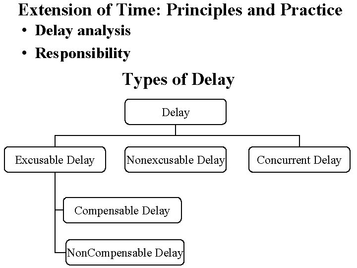 Extension of Time: Principles and Practice • Delay analysis • Responsibility Types of Delay Excusable Delay Nonexcusable Delay Compensable Delay Non. Compensable Delay Concurrent Delay