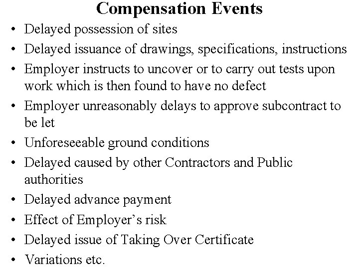 Compensation Events • Delayed possession of sites • Delayed issuance of drawings, specifications, instructions • Employer instructs to uncover or to carry out tests upon work which is then found to have no defect • Employer unreasonably delays to approve subcontract to be let • Unforeseeable ground conditions • Delayed caused by other Contractors and Public authorities • Delayed advance payment • Effect of Employer’s risk • Delayed issue of Taking Over Certificate • Variations etc.