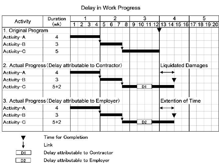 Types of Delay cont… • Excusable delay: delay beyond the fault of either the Contractor or the owner; or not caused by Contractor’s negligence for which Time compensation possible üDelay not caused by either party üDelay caused by Owner üDelay caused by Engineer • Non-excusable delay: delay reasonably foreseeable and within control of the contractor for which no monetary compensation or time extension will be granted. üE. g. Slow progress, faulty workmanship, inadequate labor force, late delivery of materials, failure to coordinate subcontractors • Compensable delay: Excusable delay for which the Contractor may be entitled Monetary compensation and Time extension