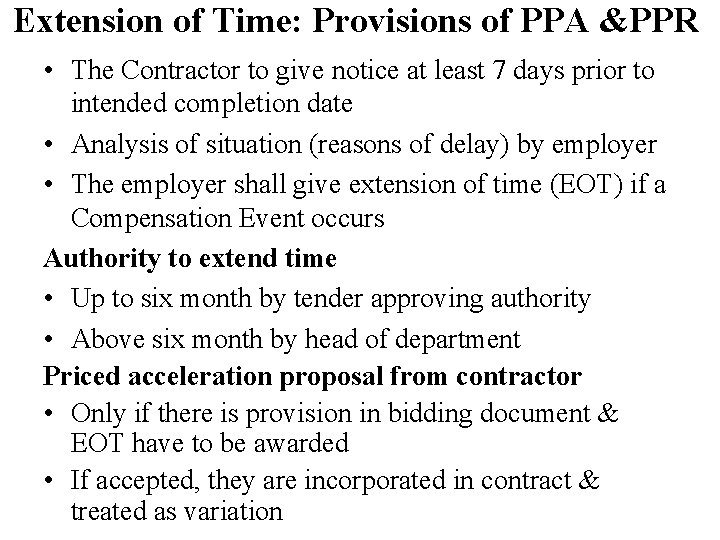 Extension of Time: Provisions of PPA &PPR • The Contractor to give notice at least 7 days prior to intended completion date • Analysis of situation (reasons of delay) by employer • The employer shall give extension of time (EOT) if a Compensation Event occurs Authority to extend time • Up to six month by tender approving authority • Above six month by head of department Priced acceleration proposal from contractor • Only if there is provision in bidding document & EOT have to be awarded • If accepted, they are incorporated in contract & treated as variation