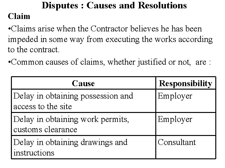 Disputes : Causes and Resolutions Claim • Claims arise when the Contractor believes he has been impeded in some way from executing the works according to the contract. • Common causes of claims, whether justified or not, are : Cause Delay in obtaining possession and access to the site Delay in obtaining work permits, customs clearance Delay in obtaining drawings and instructions Responsibility Employer Consultant
