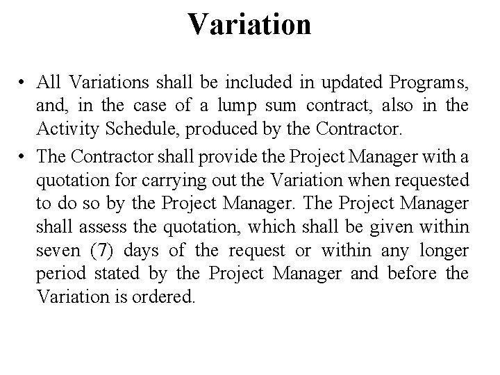 Variation • All Variations shall be included in updated Programs, and, in the case of a lump sum contract, also in the Activity Schedule, produced by the Contractor. • The Contractor shall provide the Project Manager with a quotation for carrying out the Variation when requested to do so by the Project Manager. The Project Manager shall assess the quotation, which shall be given within seven (7) days of the request or within any longer period stated by the Project Manager and before the Variation is ordered.