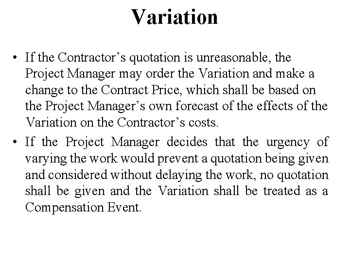 Variation • If the Contractor’s quotation is unreasonable, the Project Manager may order the Variation and make a change to the Contract Price, which shall be based on the Project Manager’s own forecast of the effects of the Variation on the Contractor’s costs. • If the Project Manager decides that the urgency of varying the work would prevent a quotation being given and considered without delaying the work, no quotation shall be given and the Variation shall be treated as a Compensation Event.