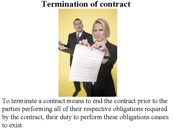 Termination of contract cont… Possible situations of terminating contract cont… d. Lack of capacity : A contract entered into by a party who lacks capacity, or ability, to contract, such as a minor, or a person with a mental illness, is voidable by the party who lacks capacity. e. Illegality : A contract entered into for an illegal purpose is void. This means that either party may terminate the contract at any time, because legally, there is no contract. f. Mutual mistake: If both of the parties make a mistake concerning a material fact, the party affected by the mistake may terminate the contract, so long as the other party has not yet performed.