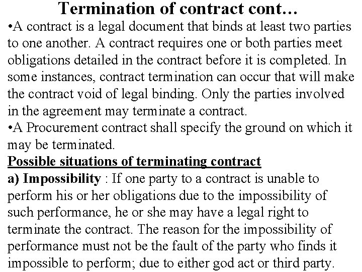Termination of contract cont… • A contract is a legal document that binds at least two parties to one another. A contract requires one or both parties meet obligations detailed in the contract before it is completed. In some instances, contract termination can occur that will make the contract void of legal binding. Only the parties involved in the agreement may terminate a contract. • A Procurement contract shall specify the ground on which it may be terminated. Possible situations of terminating contract a) Impossibility : If one party to a contract is unable to perform his or her obligations due to the impossibility of such performance, he or she may have a legal right to terminate the contract. The reason for the impossibility of performance must not be the fault of the party who finds it impossible to perform; due to either god act or third party.