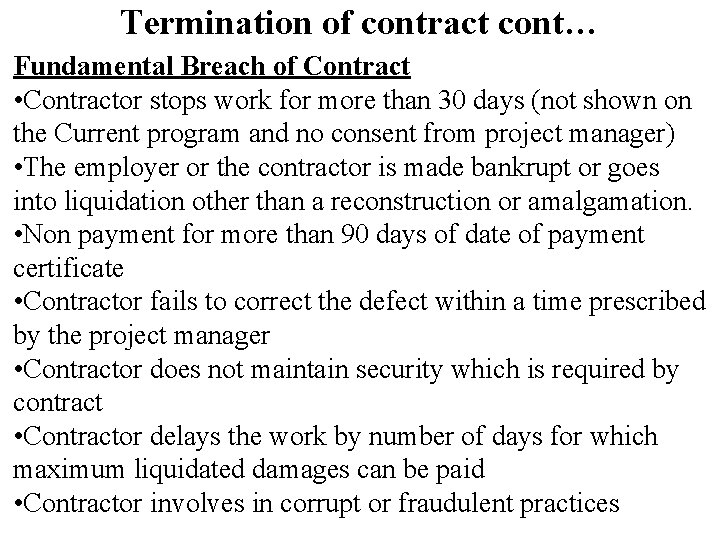 Termination of contract cont… Fundamental Breach of Contract • Contractor stops work for more than 30 days (not shown on the Current program and no consent from project manager) • The employer or the contractor is made bankrupt or goes into liquidation other than a reconstruction or amalgamation. • Non payment for more than 90 days of date of payment certificate • Contractor fails to correct the defect within a time prescribed by the project manager • Contractor does not maintain security which is required by contract • Contractor delays the work by number of days for which maximum liquidated damages can be paid • Contractor involves in corrupt or fraudulent practices