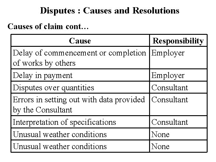 Disputes : Causes and Resolutions Causes of claim cont… Cause Delay of commencement or completion of works by others Delay in payment Disputes over quantities Errors in setting out with data provided by the Consultant Interpretation of specifications Unusual weather conditions Responsibility Employer Consultant None
