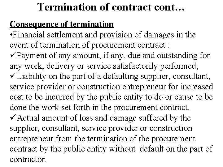 Termination of contract cont… Consequence of termination • Financial settlement and provision of damages in the event of termination of procurement contract : üPayment of any amount, if any, due and outstanding for any work, delivery or service satisfactorily performed; üLiability on the part of a defaulting supplier, consultant, service provider or construction entrepreneur for increased cost to be incurred by the public entity to do or cause to be done the work set forth in the procurement contract. üActual amount of loss and damage suffered by the supplier, consultant, service provider or construction entrepreneur from the termination of the procurement contract by the public entity without default on the part of contractor.