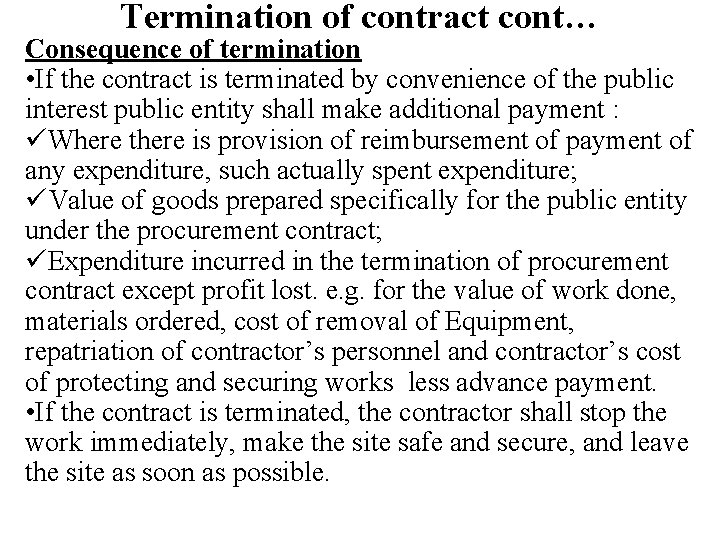 Termination of contract cont… Consequence of termination • If the contract is terminated by convenience of the public interest public entity shall make additional payment : üWhere there is provision of reimbursement of payment of any expenditure, such actually spent expenditure; üValue of goods prepared specifically for the public entity under the procurement contract; üExpenditure incurred in the termination of procurement contract except profit lost. e. g. for the value of work done, materials ordered, cost of removal of Equipment, repatriation of contractor’s personnel and contractor’s cost of protecting and securing works less advance payment. • If the contract is terminated, the contractor shall stop the work immediately, make the site safe and secure, and leave the site as soon as possible.