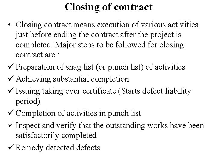 Closing of contract • Closing contract means execution of various activities just before ending the contract after the project is completed. Major steps to be followed for closing contract are : ü Preparation of snag list (or punch list) of activities ü Achieving substantial completion ü Issuing taking over certificate (Starts defect liability period) ü Completion of activities in punch list ü Inspect and verify that the outstanding works have been satisfactorily completed ü Remedy detected defects