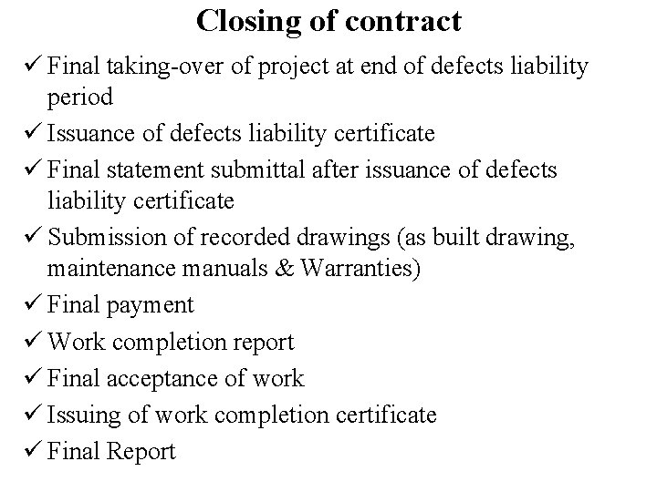 Closing of contract ü Final taking-over of project at end of defects liability period ü Issuance of defects liability certificate ü Final statement submittal after issuance of defects liability certificate ü Submission of recorded drawings (as built drawing, maintenance manuals & Warranties) ü Final payment ü Work completion report ü Final acceptance of work ü Issuing of work completion certificate ü Final Report