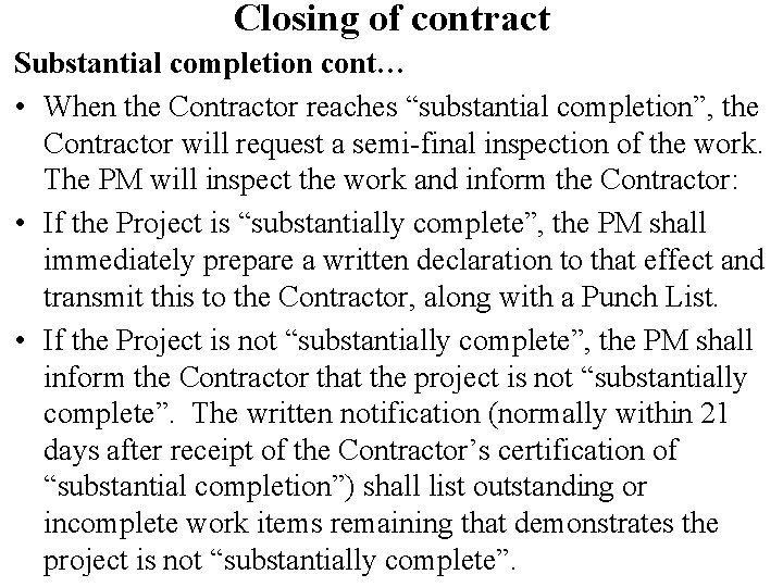 Closing of contract Substantial completion cont… • When the Contractor reaches “substantial completion”, the Contractor will request a semi-final inspection of the work. The PM will inspect the work and inform the Contractor: • If the Project is “substantially complete”, the PM shall immediately prepare a written declaration to that effect and transmit this to the Contractor, along with a Punch List. • If the Project is not “substantially complete”, the PM shall inform the Contractor that the project is not “substantially complete”. The written notification (normally within 21 days after receipt of the Contractor’s certification of “substantial completion”) shall list outstanding or incomplete work items remaining that demonstrates the project is not “substantially complete”.