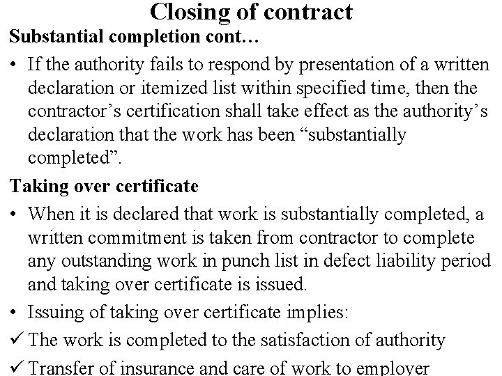 Closing of contract Substantial completion cont… • If the authority fails to respond by presentation of a written declaration or itemized list within specified time, then the contractor’s certification shall take effect as the authority’s declaration that the work has been “substantially completed”. Taking over certificate • When it is declared that work is substantially completed, a written commitment is taken from contractor to complete any outstanding work in punch list in defect liability period and taking over certificate is issued. • Issuing of taking over certificate implies: ü The work is completed to the satisfaction of authority ü Transfer of insurance and care of work to employer