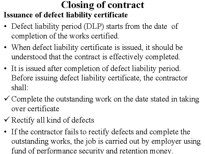 Closing of contract Issuance of defect liability certificate • Defect liability period (DLP) starts from the date of completion of the works certified. • When defect liability certificate is issued, it should be understood that the contract is effectively completed. • It is issued after completion of defect liability period. Before issuing defect liability certificate, the contractor shall: ü Complete the outstanding work on the date stated in taking over certificate ü Rectify all kind of defects • If the contractor fails to rectify defects and complete the outstanding works, the job is carried out by employer using fund of performance security and retention money.