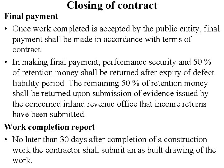 Closing of contract Final payment • Once work completed is accepted by the public entity, final payment shall be made in accordance with terms of contract. • In making final payment, performance security and 50 % of retention money shall be returned after expiry of defect liability period. The remaining 50 % of retention money shall be returned upon submission of evidence issued by the concerned inland revenue office that income returns have been submitted. Work completion report • No later than 30 days after completion of a construction work the contractor shall submit an as built drawing of the work.