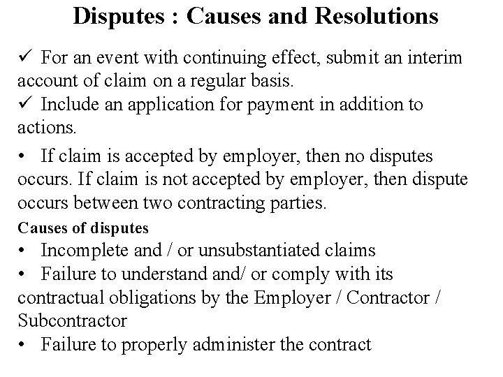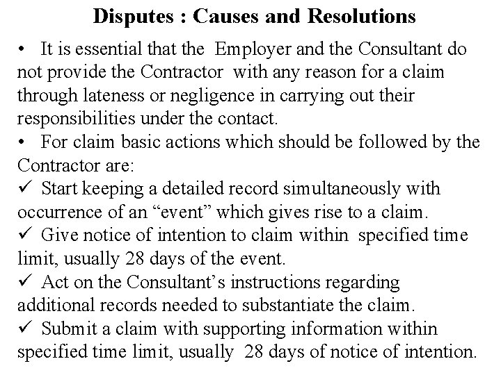 Disputes : Causes and Resolutions • It is essential that the Employer and the Consultant do not provide the Contractor with any reason for a claim through lateness or negligence in carrying out their responsibilities under the contact. • For claim basic actions which should be followed by the Contractor are: ü Start keeping a detailed record simultaneously with occurrence of an “event” which gives rise to a claim. ü Give notice of intention to claim within specified time limit, usually 28 days of the event. ü Act on the Consultant’s instructions regarding additional records needed to substantiate the claim. ü Submit a claim with supporting information within specified time limit, usually 28 days of notice of intention.