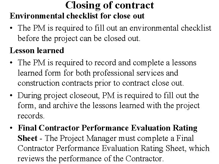 Closing of contract Environmental checklist for close out • The PM is required to fill out an environmental checklist before the project can be closed out. Lesson learned • The PM is required to record and complete a lessons learned form for both professional services and construction contracts prior to contract close out. • During project closeout, PM is required to fill out the form, and archive the lessons learned with the project records. • Final Contractor Performance Evaluation Rating Sheet - The Project Manager must complete a Final Contractor Performance Evaluation Rating Sheet, which reviews the performance of the Contractor.