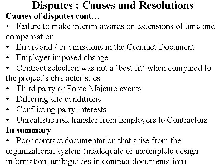 Disputes : Causes and Resolutions Causes of disputes cont… • Failure to make interim awards on extensions of time and compensation • Errors and / or omissions in the Contract Document • Employer imposed change • Contract selection was not a ‘best fit’ when compared to the project’s characteristics • Third party or Force Majeure events • Differing site conditions • Conflicting party interests • Unrealistic risk transfer from Employers to Contractors In summary • Poor contract documentation that arise from the organizational system (inadequate or incomplete design information, ambiguities in contract documentation)