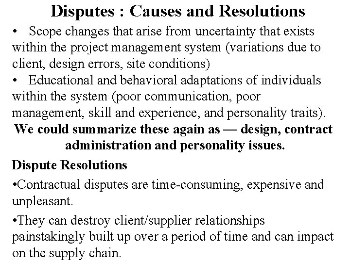 Disputes : Causes and Resolutions • Scope changes that arise from uncertainty that exists within the project management system (variations due to client, design errors, site conditions) • Educational and behavioral adaptations of individuals within the system (poor communication, poor management, skill and experience, and personality traits). We could summarize these again as — design, contract administration and personality issues. Dispute Resolutions • Contractual disputes are time-consuming, expensive and unpleasant. • They can destroy client/supplier relationships painstakingly built up over a period of time and can impact on the supply chain.