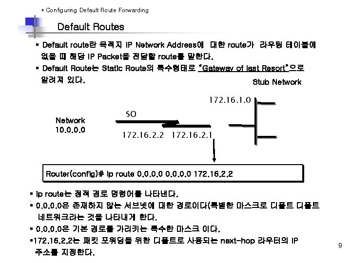 Static Routes Example Stub Network 172. 16. 1. 0 Network SO A 172. 16. 2. 2 172. 16. 2. 1 BB Router(config)# ip route 172. 16. 1. 0 255. 0 172. 16. 2. 1 8
