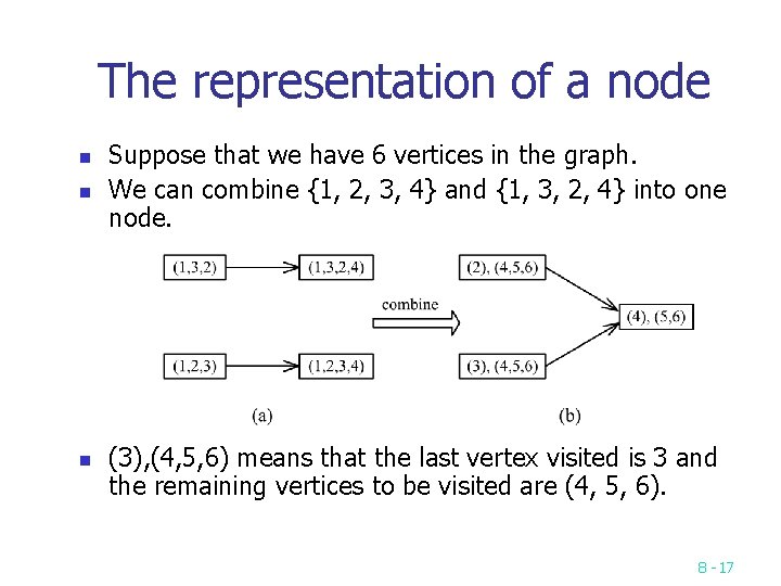 The representation of a node n n n Suppose that we have 6 vertices in the graph. We can combine {1, 2, 3, 4} and {1, 3, 2, 4} into one node. (3), (4, 5, 6) means that the last vertex visited is 3 and the remaining vertices to be visited are (4, 5, 6). 8 -17