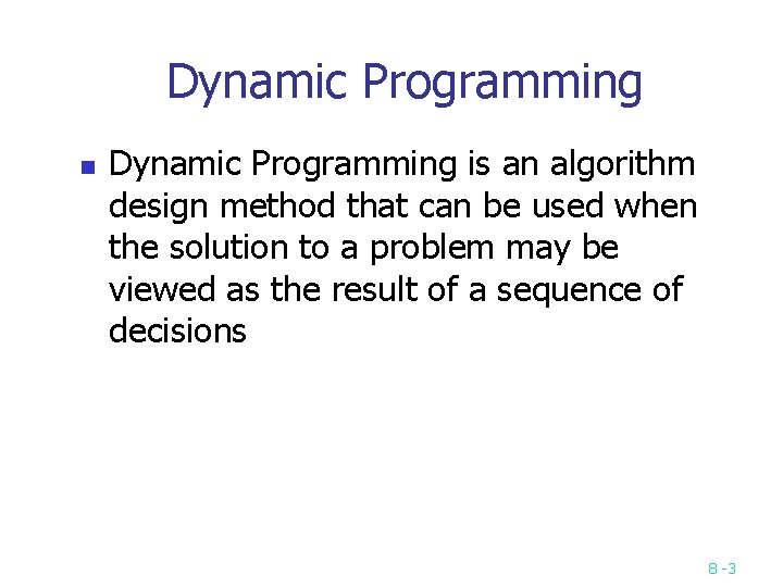 Dynamic Programming n Dynamic Programming is an algorithm design method that can be used when the solution to a problem may be viewed as the result of a sequence of decisions 8 -3