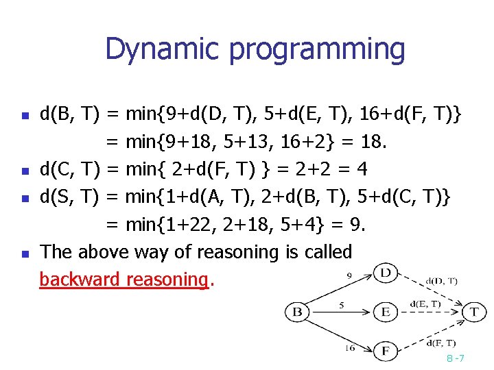 Dynamic programming n n d(B, T) = min{9+d(D, T), 5+d(E, T), 16+d(F, T)} = min{9+18, 5+13, 16+2} = 18. d(C, T) = min{ 2+d(F, T) } = 2+2 = 4 d(S, T) = min{1+d(A, T), 2+d(B, T), 5+d(C, T)} = min{1+22, 2+18, 5+4} = 9. The above way of reasoning is called backward reasoning. 8 -7