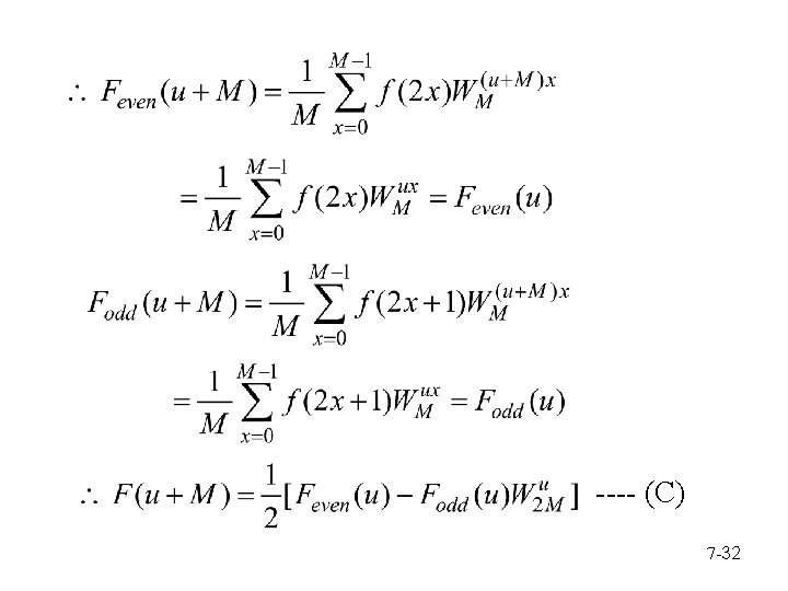 ○ Analysis : The Fourier sequence F(u), u = 0 , … , N-1 of f(x), x = 0 , … , N-1 can be formed from sequences u = 0 , …… , M-1 Recursively divide F(u) and F(u+M), eventually each contains one element F(u), i. e. , u = 0, and F(u) = f(x). 7 -33