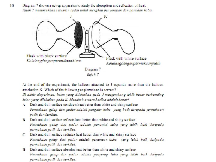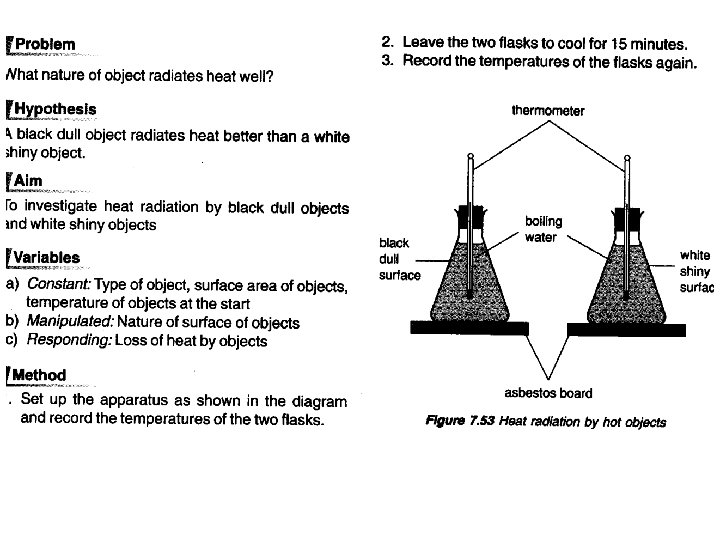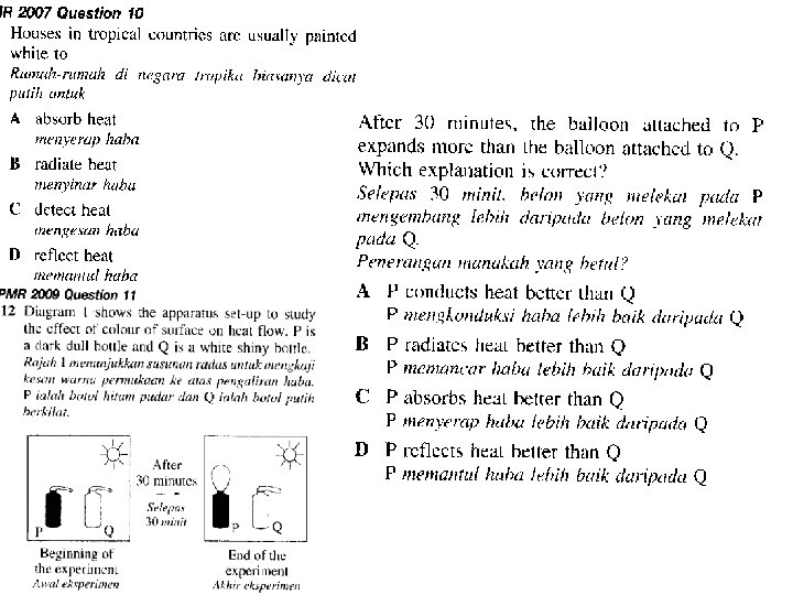 The use of the principle of expansion and contraction of matter in solving simple problems • a. Opening a tight cap PMR 08 • • 1. The cap can be removed easily by dipping it into hot water for a few minutes. This is because the cap expands when it is heated by the hot water and became loose. • DARK, DULL OBJECTS ABSORB AND GIVE OUT HEAT BETTER 1. Dark and dull objects : a. absorb heat better than white, shiny objects. b. give out (transmit) heat better than white shiny objects. 2. A white, shiny surface is a poor absorber and poor radiator of heat. 3. The ability of an object to absorb and give out heat depends on : a. the surrounding temperature b. the surface properly of an object. 4. White and shiny objects reflects heat better than dark and dull objects.