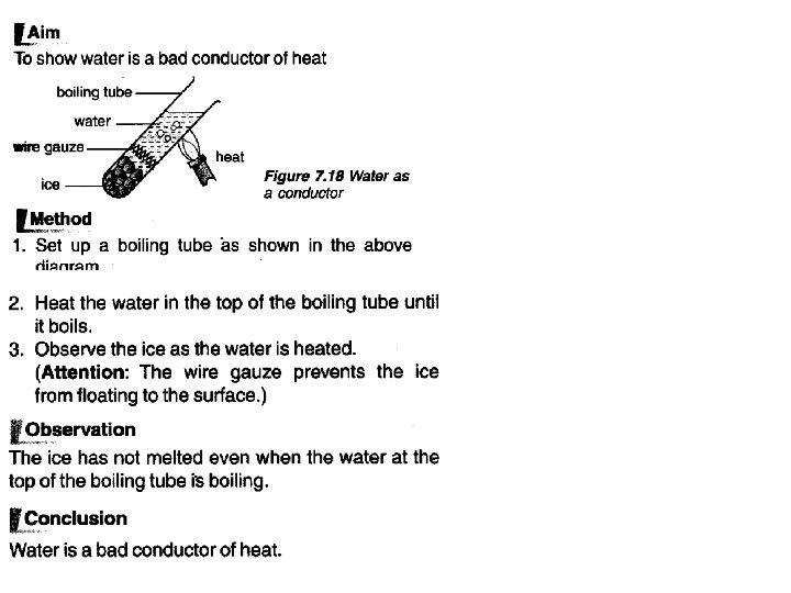 CONDUCTION • When one end of a metal rod is heated by a Bunsen flame, the particles of the metal rod near the flame get extra heat energy from the flame. • The particles vibrate more vigorously, knocking into neighbours particles and transferring energy to them. • The neighbouring particles, in turn, knock their neighbours and pass energy to them. • Thus, heat is carried along the rod from the hot end to the cold end.